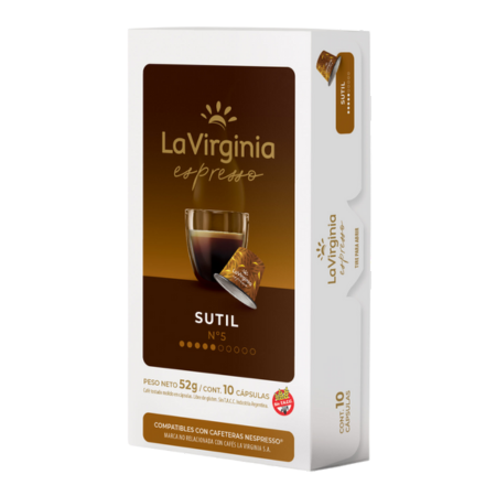 Café en cápsulas, marca La Virginia, sabor Sutil. Cápsula por 5,2 gr. Contenido de la caja: 10 unidades.